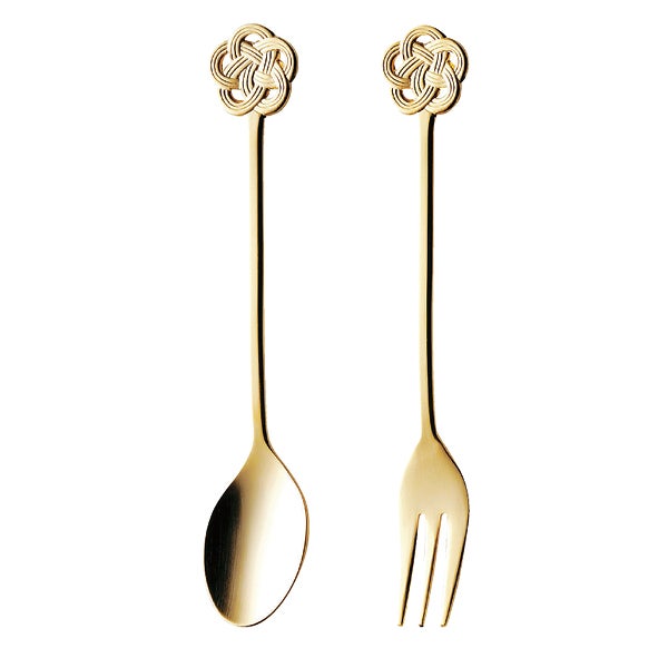 縁起の良い水引をモチーフにしたカトラリーのセットです。落ち着いたイメージのマットゴールド仕上げです。
